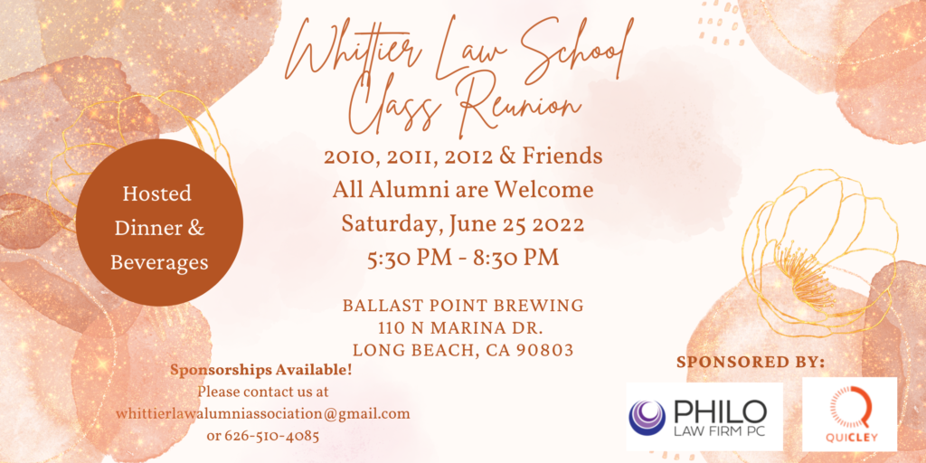 The event is open to all alumni, professors, and friends of the Whittier law community. We look forward to reuniting with fellow alumni from all classes and celebrating the 10 year reunion for the classes of 2010, 2011, and 2012.